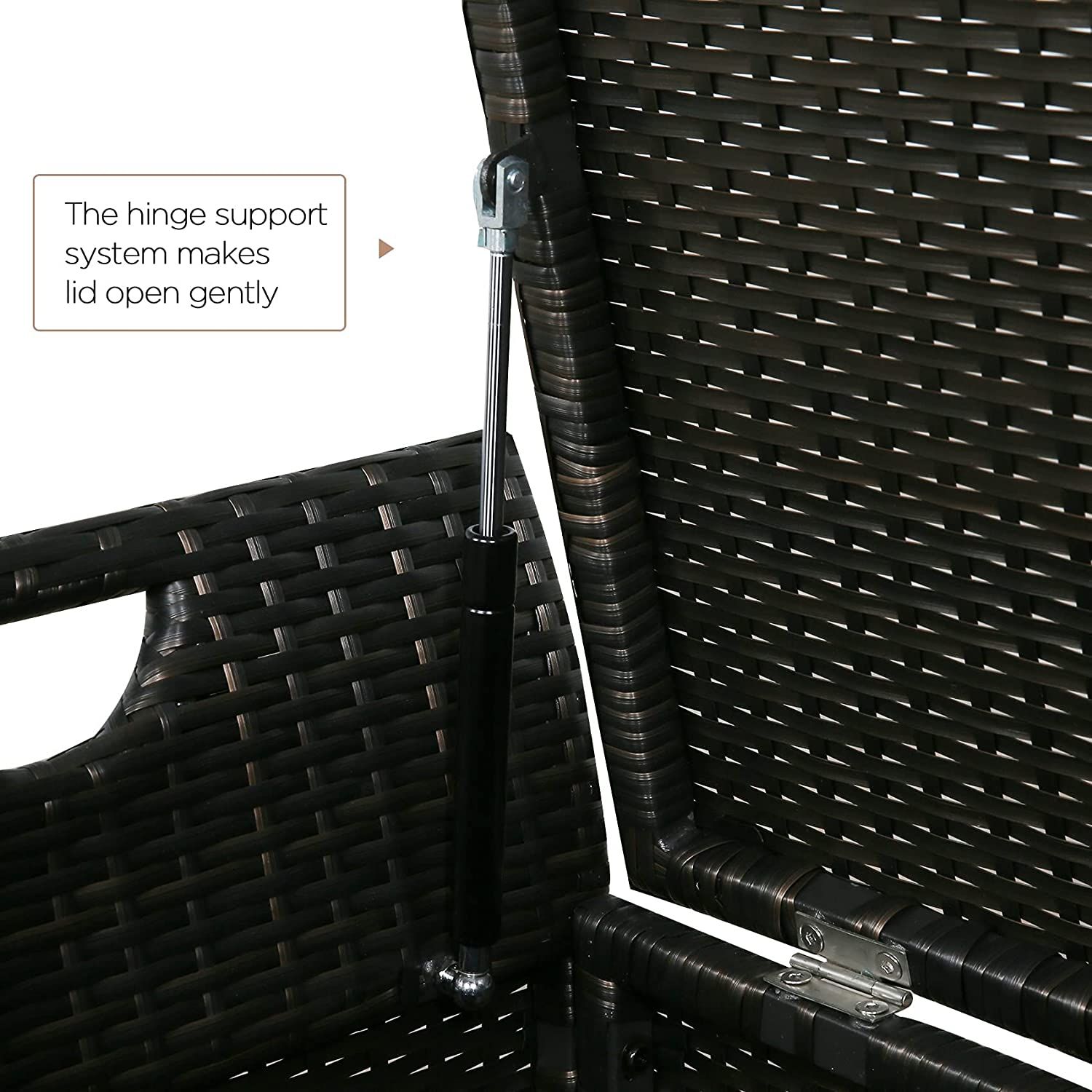Our all-weather wicker storage bench is durable and functional. It designed with side handle to make you easy to move and carry this deck box. The thick bench cushion also make you more comfortable to sit on it and designed with zipper to detach and clean it easily. Appropriate storage capacity enough to store pool toys, gardening supplies,lawn chair cushions and more. The power-coated steel frame is rust-resistant for long-lasting use. It is wrapped with hand-woven PE wicker, which is weather-resistant and high-quality to add extra fashion. Advanced pneumatic support system to make lids soft open and close gently. It will give you extra seating experience with a flat top surface. You can enjoy the outdoor storage bench in unison with the great outdoors for many years to come.