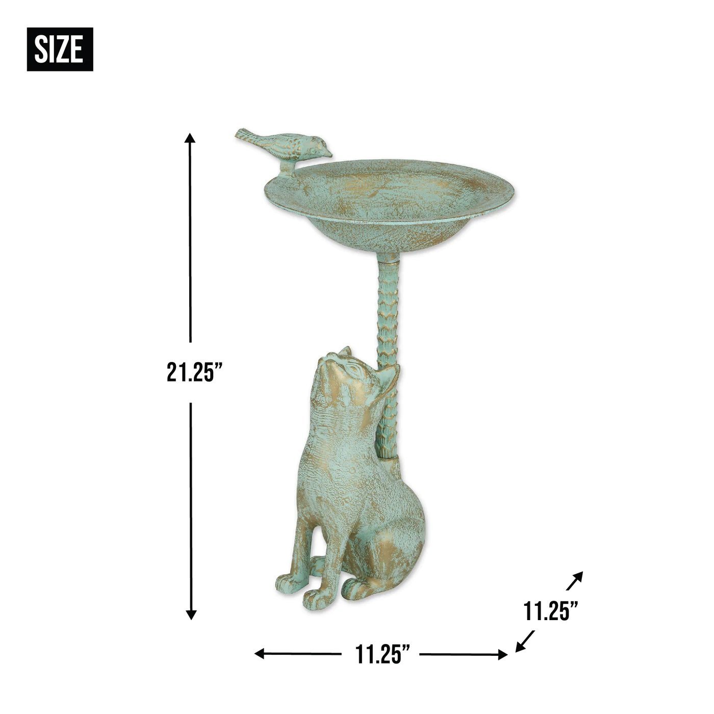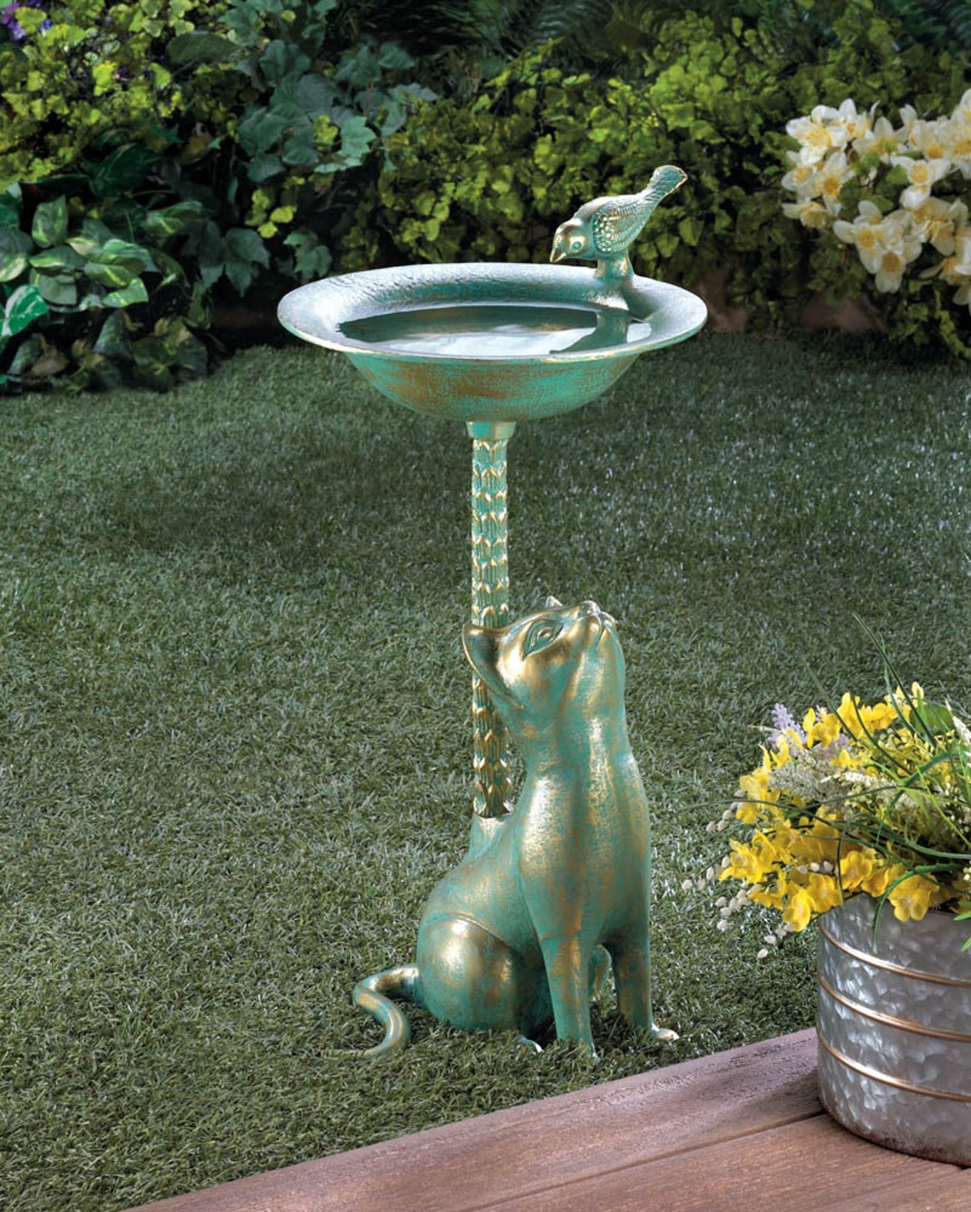 • Brave birds will love to stop by this curious cat's bath to take a drink or wet their feathers. Made from aluminum with a beautiful and unique green and gold finish, this outdoor birdbath features a cat looking up to the birdbath basin, and a small birdie sculpture on the edge of the bowl. Fill it with water in your yard and enjoy watching birds flock to it.