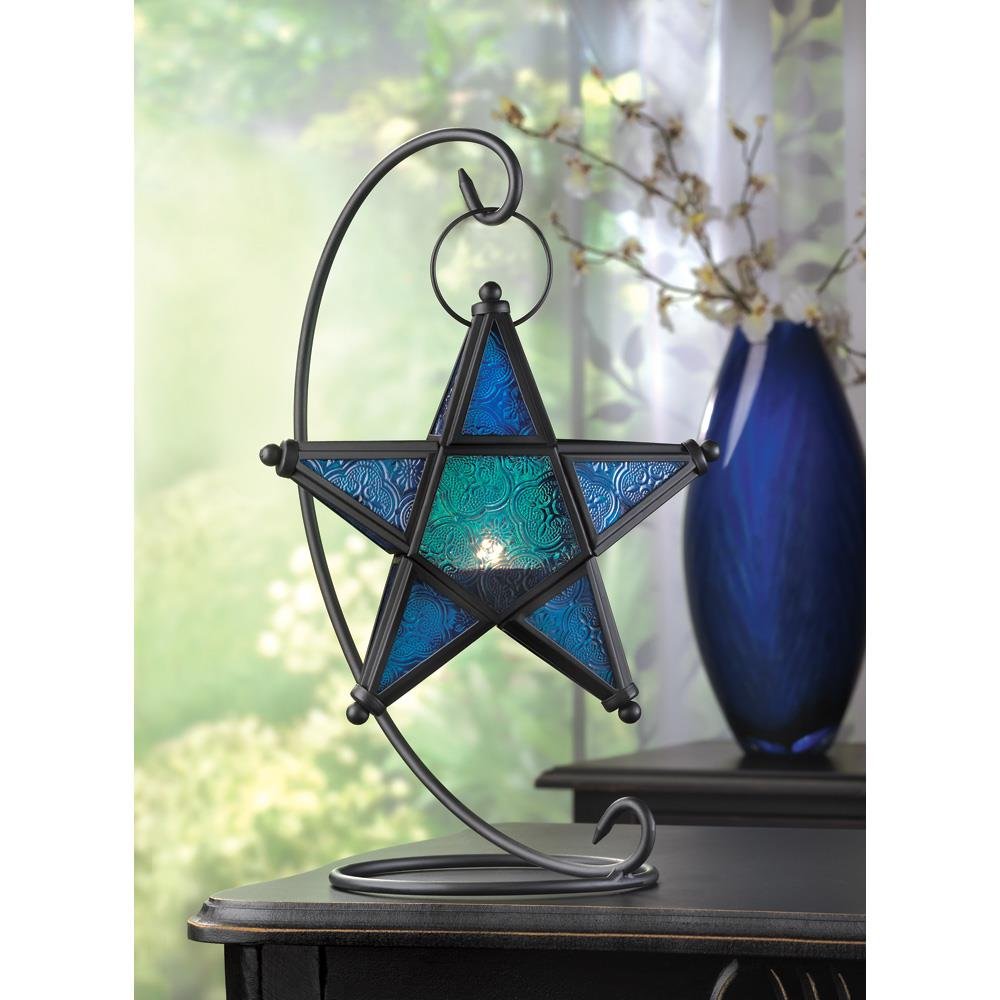 • Make a wish on this beautiful blue star! Simply add a candle to this lovely accent lantern to fill the area with an enchanting azure light. Beautifully fashioned from matte black metal and pressed glass for an artistic presentation.