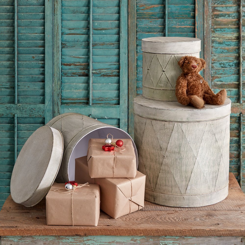 Display this Set of Three Metal Drum Tins during Christmas or all year long! It has ample space to store items inside and the ability to nest together. They are made of metal and have a vintage finish. Smallest is 10'' dia. x 10''H, Medium is 13'' dia. x 13''H, and largest is 16'' dia. x 16''H.